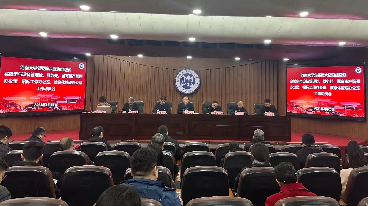 根据校党委巡察工作统一部署,2024年3月25日上午,河南大学党委第六巡察组巡察实验室与设备管理处、A级毛片无码久久精品免费、国有资产管理办公室、招标工作办公室、信息化管理办公室工作动员会召开。校党委巡察工作领导小组成员、巡察办主任田岐立,第六巡察组组长王春晓及全体成员,被巡察单位全体教职工和离退休教师代表参加了会议。实验室与设备管理处处长李声威主持动员会。